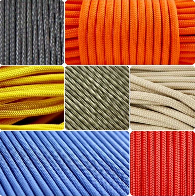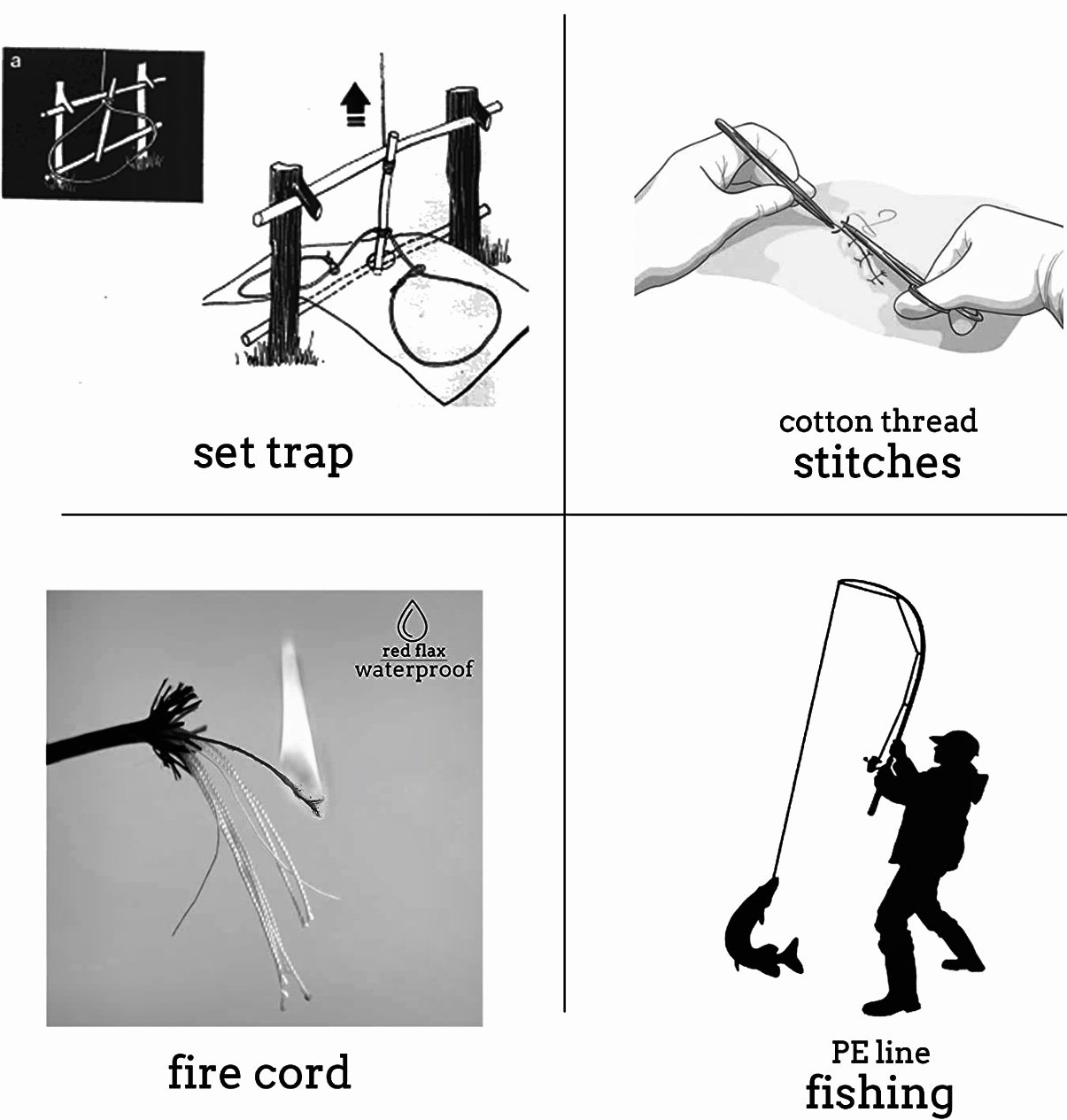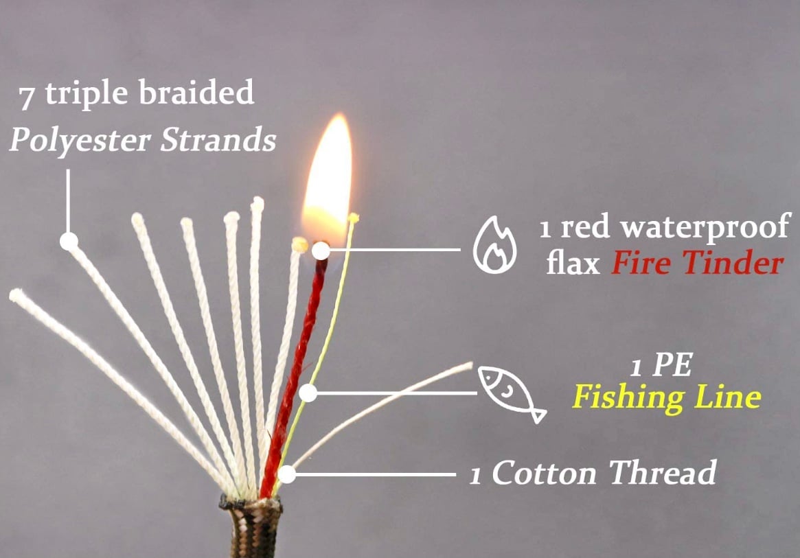 This 100% polyester cord is flexible, soft and strong with a breaking force of ropes up to 380 lbs. A fire paracord with survival cords within its core to help catch food, make fire, sew clothes or wounds, set traps, and more. The inner core consists of 7 white high-strength polyester cores, 1 red flax fire tinder, 1 PE fishing line (40 lb) and 1 cotton thread. **not intended for climbing**