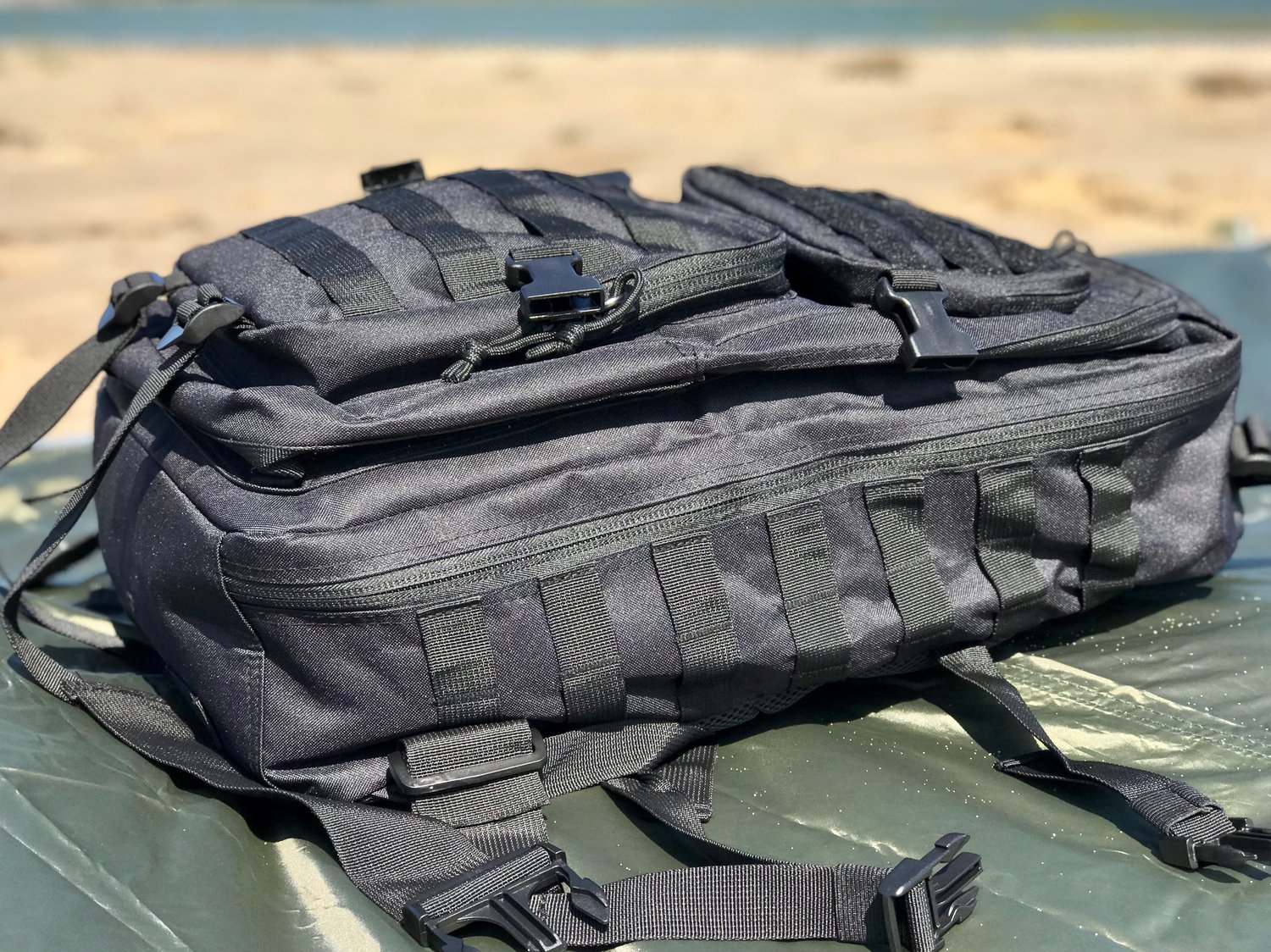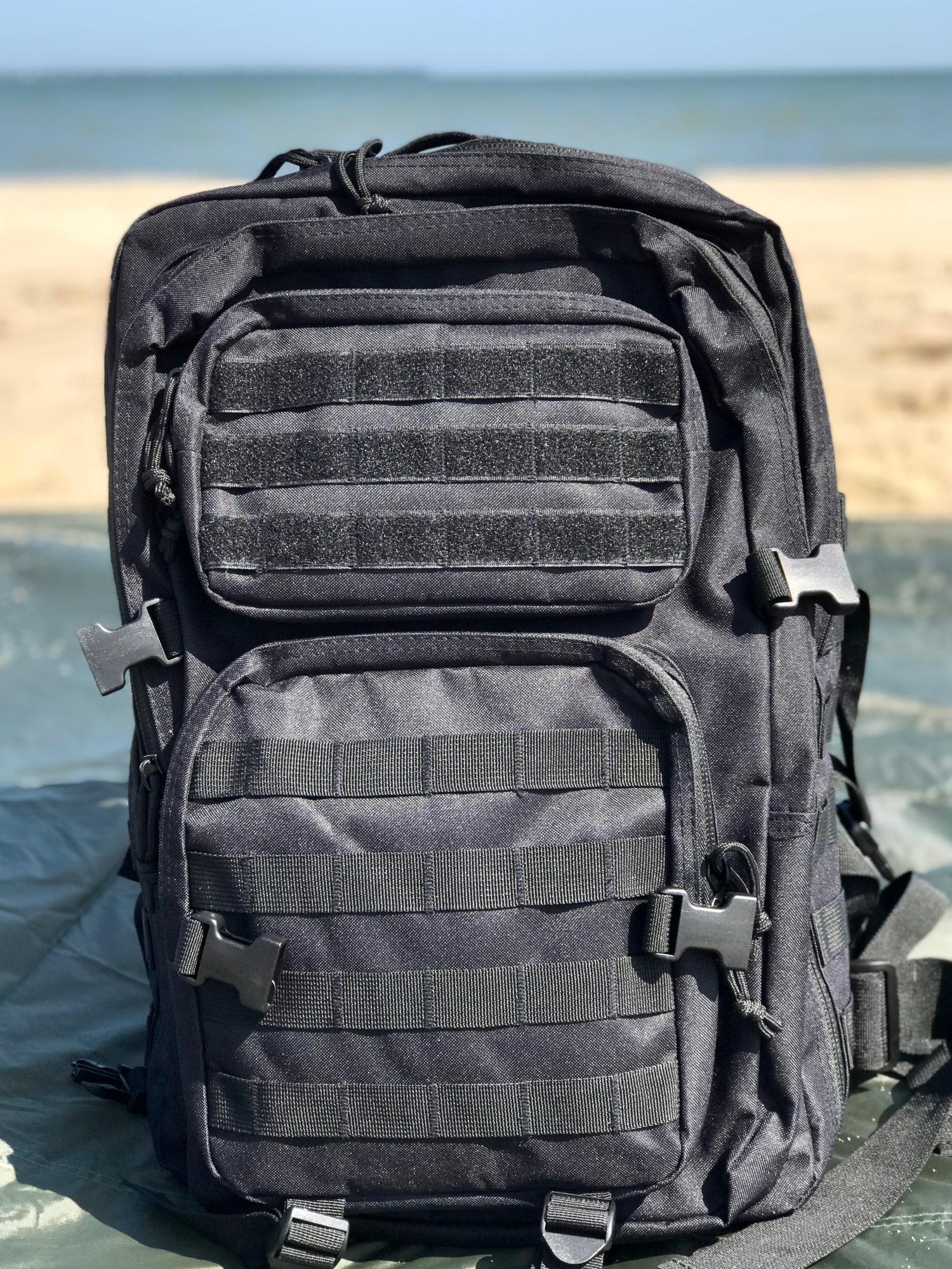 This backpack is made of high density fabric, has heavy duty zippers, and utility style cord pulls. It is durable, water resistant, and with a 40 Liter capacity it can be used as a 3 day assault pack. Another great feature is the Modular Lightweight Load-carrying Equipment (M.O.L.L.E) system webbing throughout for attaching tactical pouches or gear. There is also a compartment on the back for hydration bladder (2.5 L). *hydration bladder not included*