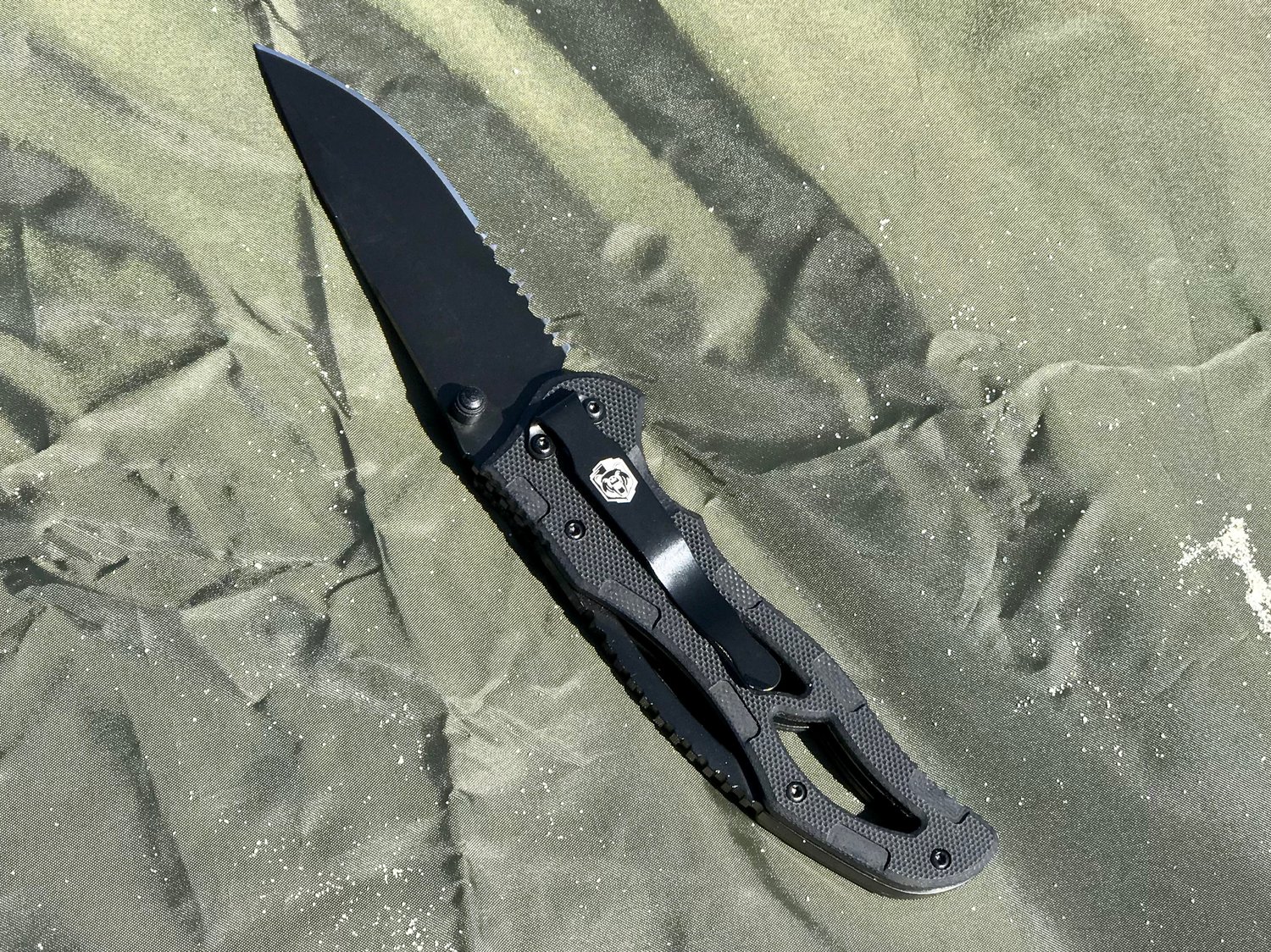 Slice, pierce or cut through tougher material more easily with this 420B stainless steel 3 1/4" blade, coated with a black oxide layer. Its open frame G10 handle is designed for agility, comfort, and forward/reverse grip. Its linear locking mechanism provides ease of use and safety.