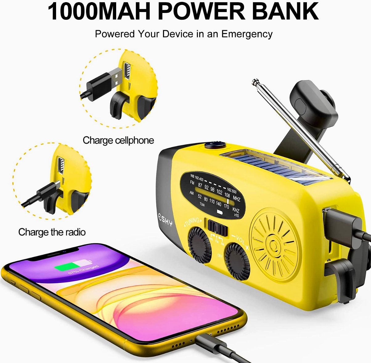 This portable and compact AM/FM/NOAA radio has 3 different charging methods: Micro and Standard USB ports, Solar Panel, and Kinetic Hand Crank. When fully charged, the battery can provide 7 hours of radio or enough light to last throughout the night with its 3 Watt built-in flashlight. You can even plug your phone or other small electronics into the USB port for some extra juice. This radio is durable and water-resistant, enabling it to withstand harsh weather conditions.