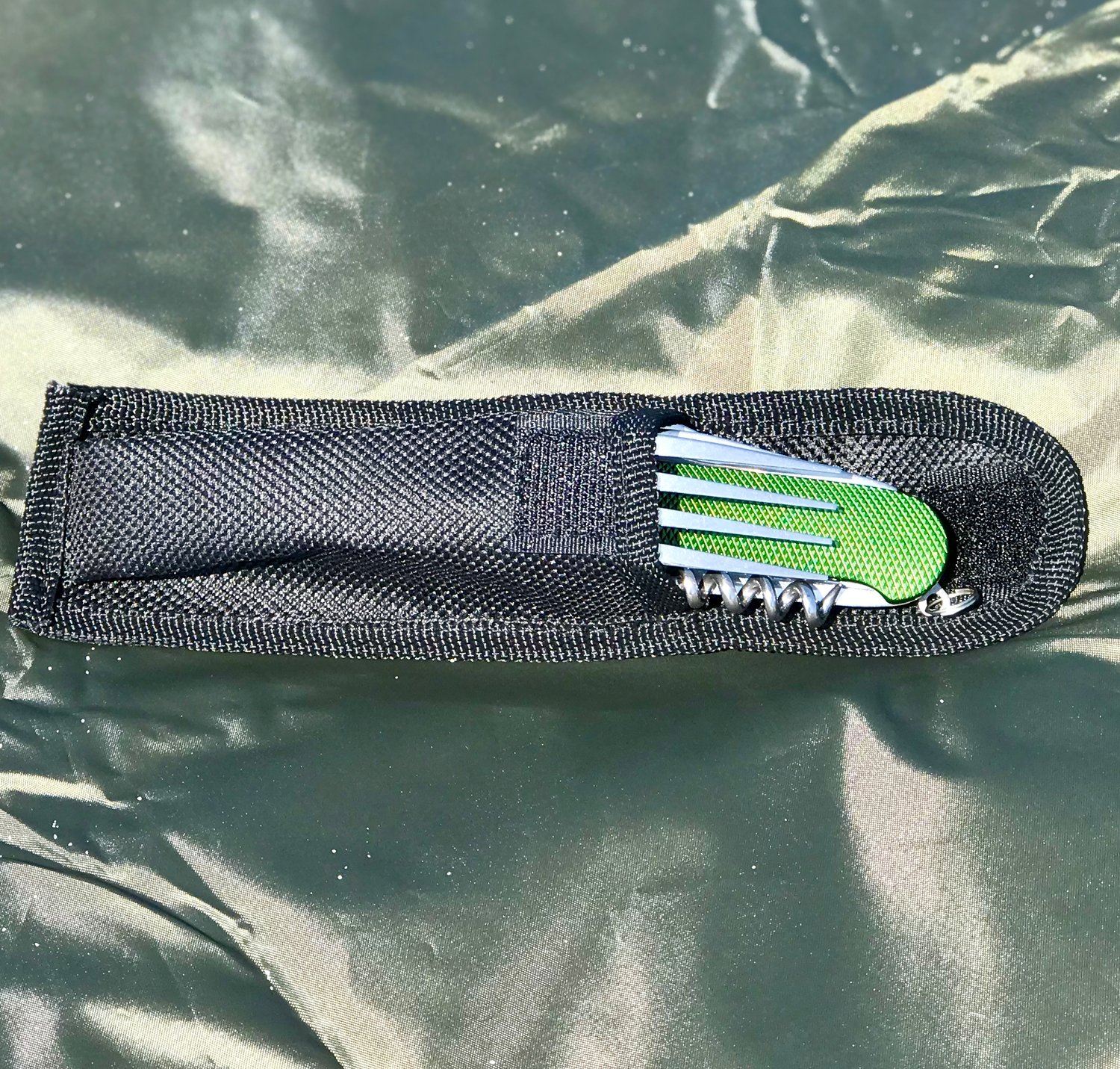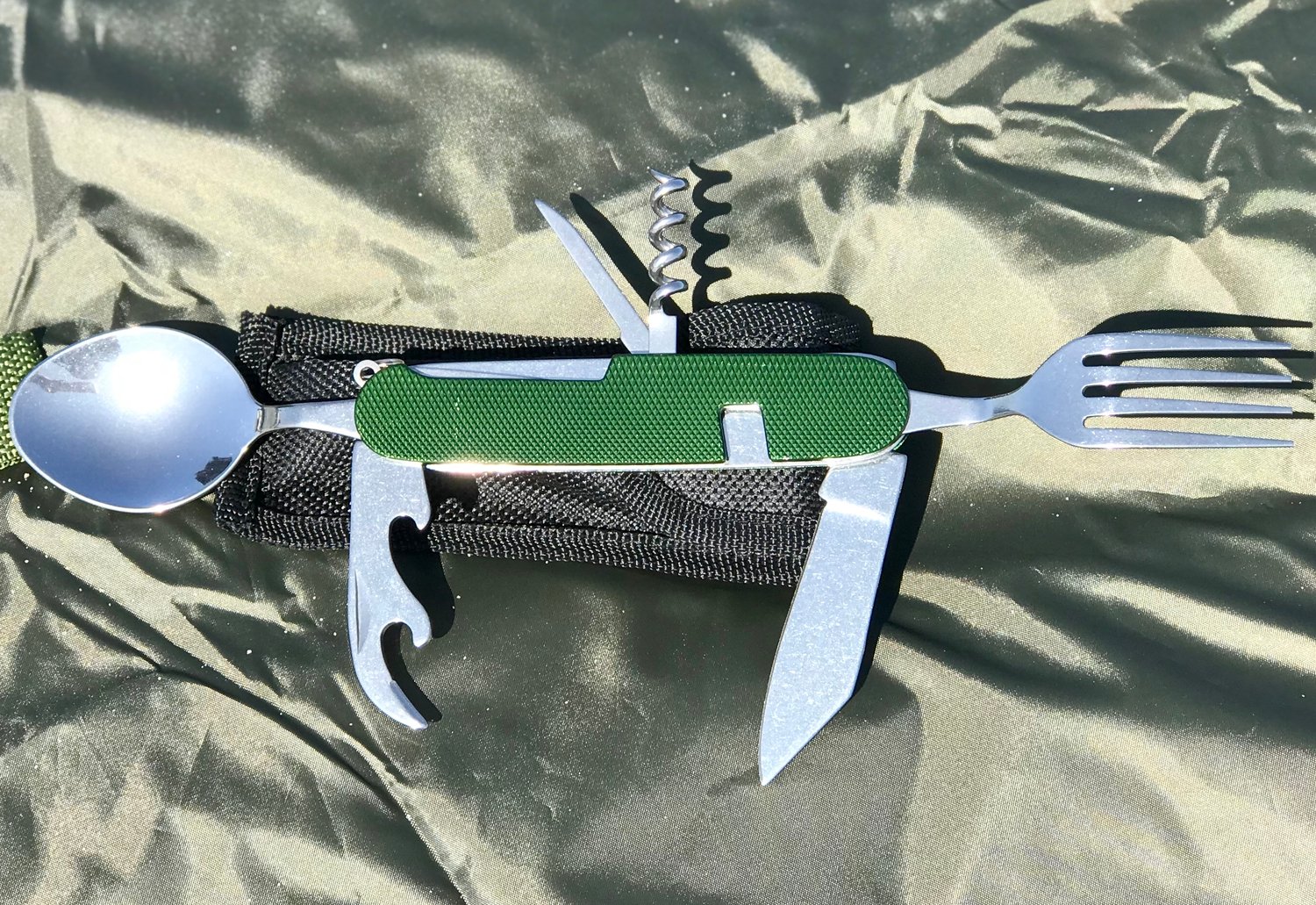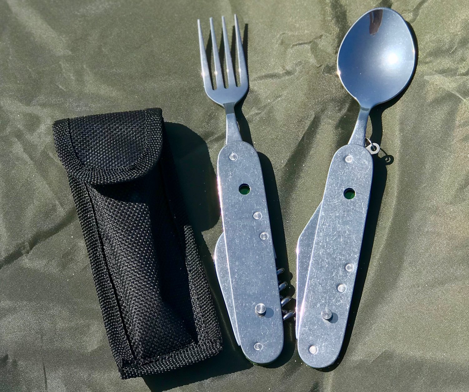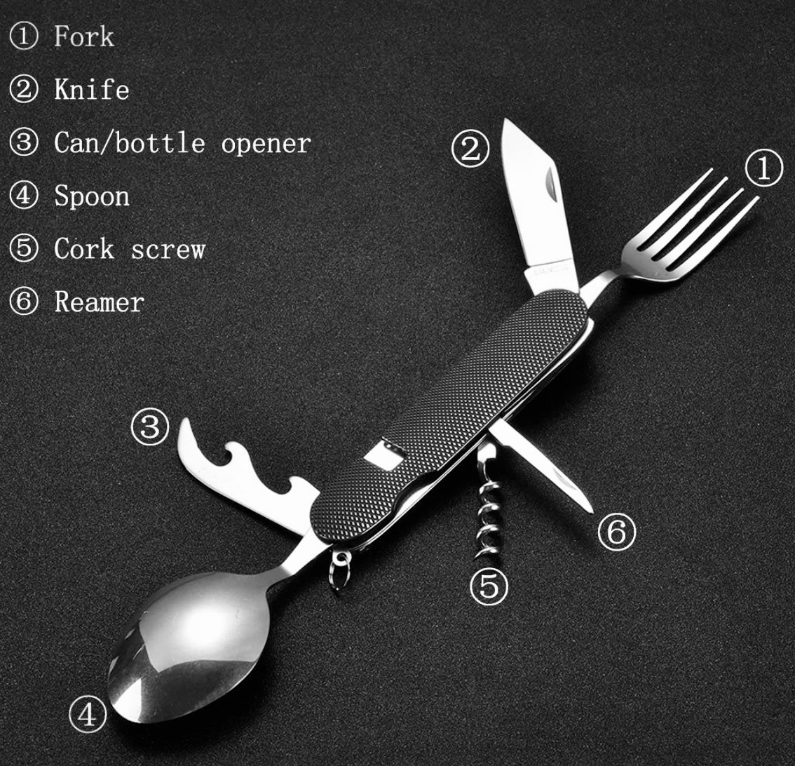 Compact and lightweight utensil set includes Spoon, Fork, Knife, Corkscrew, Bottle opener and Reamer. Weighing just 5 oz, this multi-functional camping tool won't take up much space in your survival bag. It is long lasting and has a rust free aluminum handle. Includes a nylon carrying pouch.