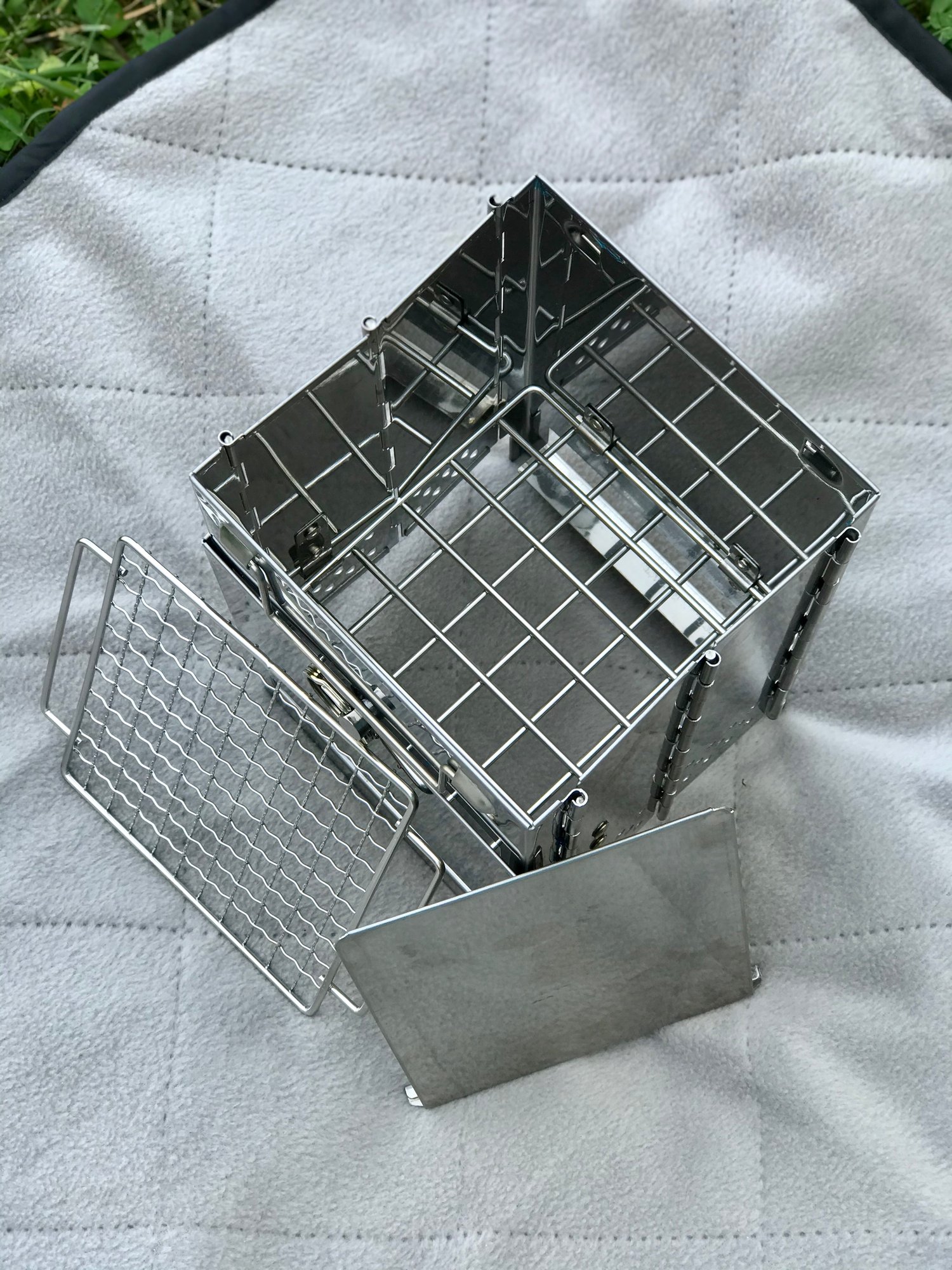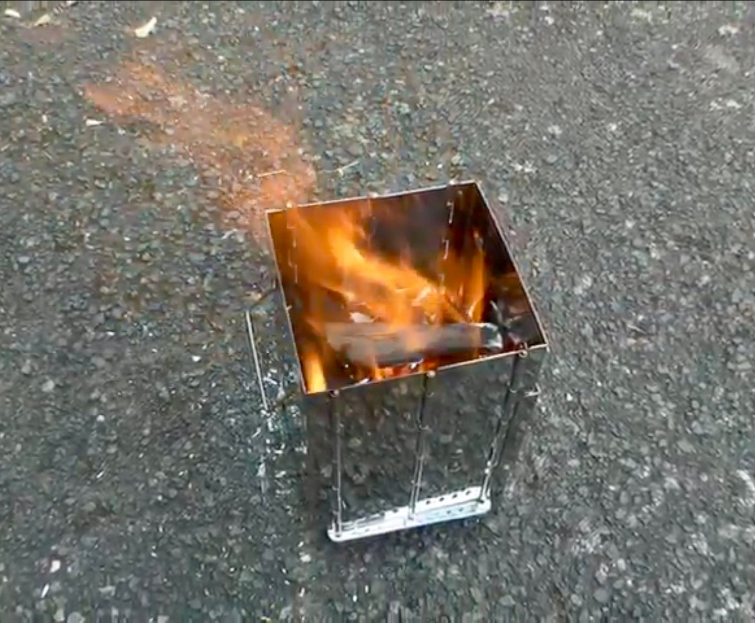 This small, portable, stainless steel stove can be fueled by leaves, twigs, wood, coal, solid fuel tablets, and even spirit burners. It is collapsible and lightweight, weighing about 1.9 lbs. Its dimensions are: